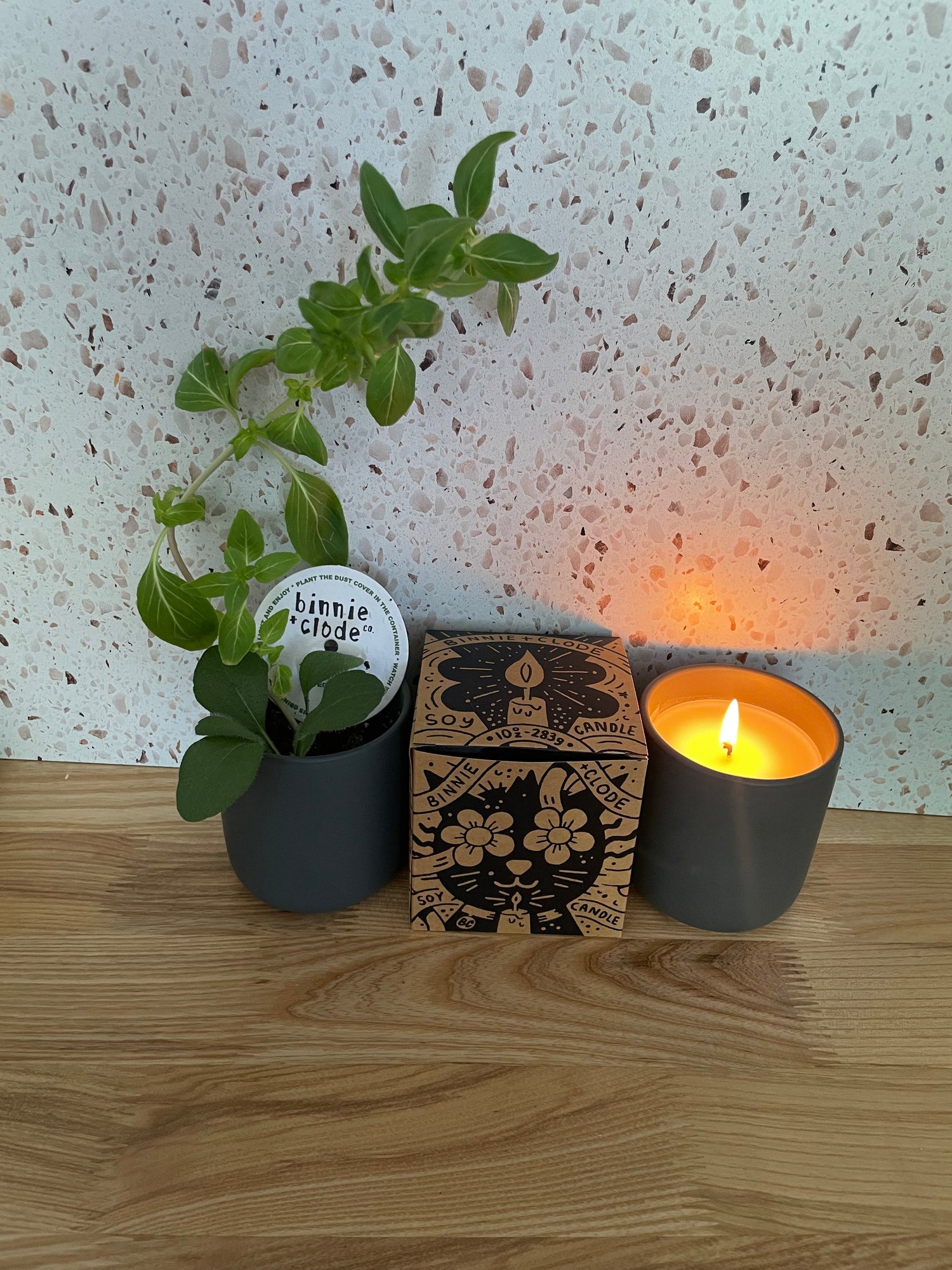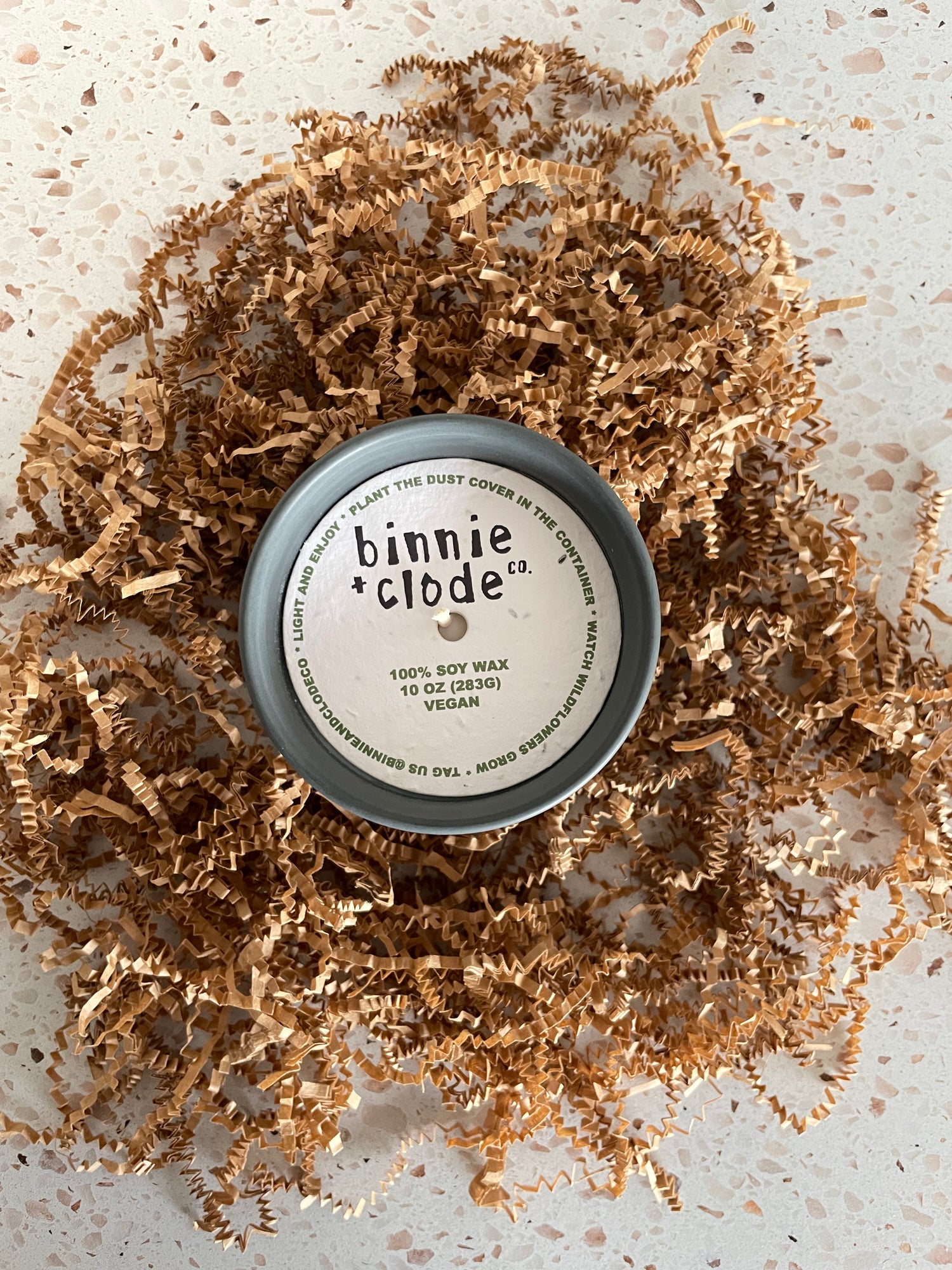 Once your candle is finished, plant your wildflower seeded paper in this container under soil. Water your seeds and place it somewhere sunny. Watch your wildflowers grow! Post a photo of your new bloom and tag us @binnieandclodeco. Please view the following page for more information on planting instructions.
